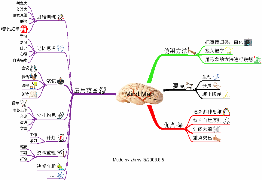 它簡單而有極其有效,是每個人必須學會和掌握的一種基本的思維技能,它融入了幾大思維系統—系統思維、邏輯思維、結構性思考、創新思維等。可以協助其他的思維工具呈現和挖掘其價值,因此它是思維工具中的工具!充分運用左右腦的機能,協助人們在科學與藝術、邏輯與想象之間平衡發展。能夠放大大腦的本能,挖掘大腦的潛能。